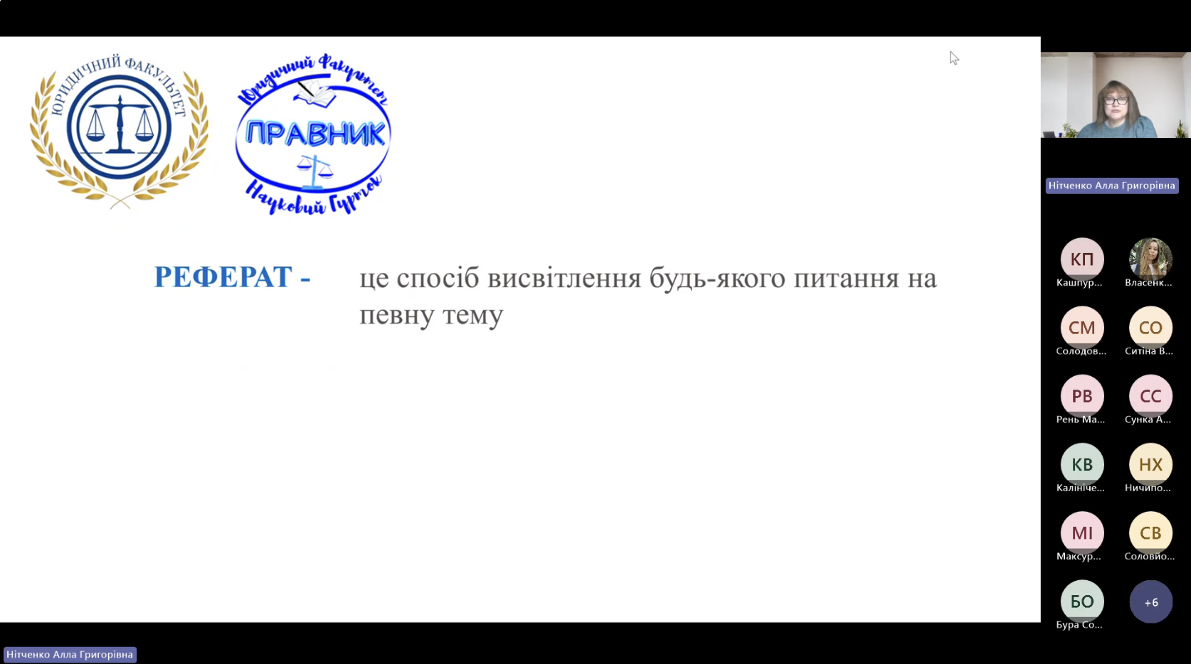 13 листопада 2025 року для студентів 1-го курсу освітнього ступеня «бакалавр» юридичного факультету відбулося чергове засідання наукового гуртка «Правник» на тему: «Як написати реферат і курсову роботу та правильно їх оформити». Захід пройшов онлайн на платформі Microsoft Teams.
