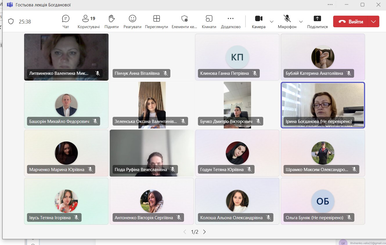 14 жовтня 2025 року для студентів другого (магістерського) рівня вищої освіти спеціальності 081 (D8) «Право» освітніх програм «Адміністративна та цивільна юстиція» та «Кримінальна юстиція (Суд. Прокуратура. Адвокатура)» відбулася гостьова лекція адвокатки – Богданової Ірини Дмитрівни.