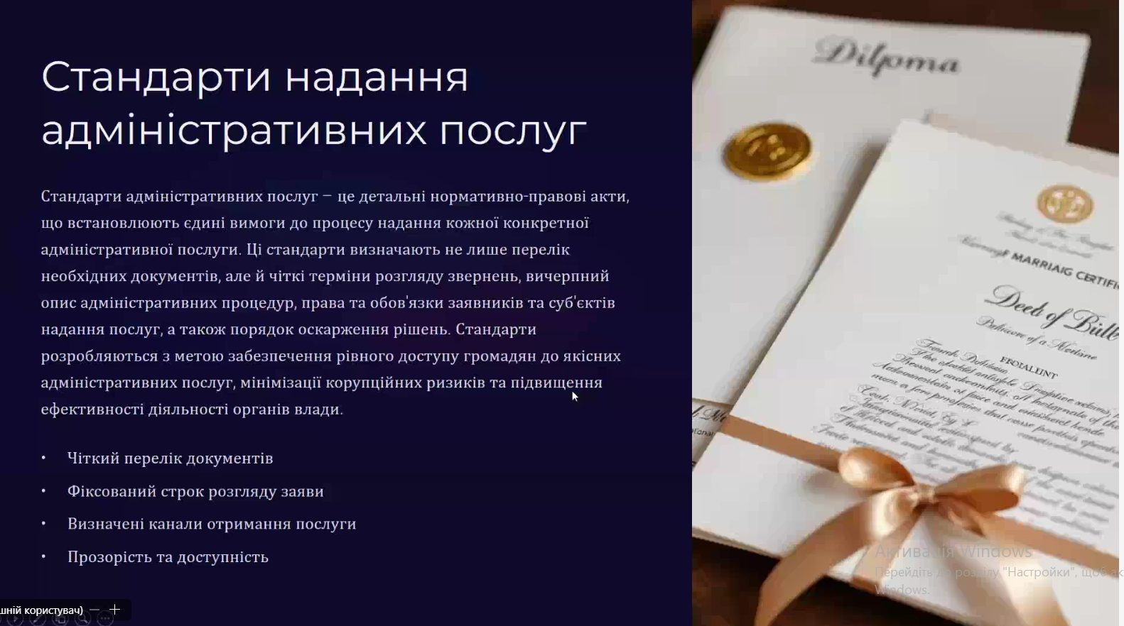 08 квітня 2025 року в рамках вивчення навчальних дисциплін «Правове регулювання адміністративних послуг в Україні», «Адміністративне право», «Адміністративне процесуальне право» (освітні програми «Право», «Цивільна та господарська юстиція (Суд. Нотаріат. правова допомога)», «Адміністративна та цивільна юстиція (Суд. Публічна адміністрація та антикорупційні органи)», «Кримінальна юстиція (Суд. Прокуратура. Адвокатура)» першого (бакалаврського) рівня вищої освіти), «Проблеми адміністративного права та процесу» (освітня програма «Адміністративна та цивільна юстиція» другого (магістерського) рівня вищої освіти), з метою ознайомлення здобувачів вищої освіти спеціальності 081 «Право» з актуальними проблемами адміністративного права та процесу в умовах воєнного стану в Україні була проведена гостьова лекція на тему: «Особливості правового регулювання адміністративних послуг в Україні».