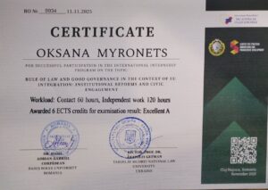 05.11 – 11.11.2025 року доцентка кафедри правоохоронної діяльності та загальноправових дисциплін юридичного факультету НУ Чернігівська політехніка Оксана Миронець пройшла міжнародне стажування та у складі програмно-організаційного комітету була модератором міжнародної конференції у межах стажування “Rule of law and good governance in the context of EU integration: institutional reforms and civic engagement” («Верховенство права та належне управління в контексті вступу до ЄС: інституційні реформи та громадянська активність») для фахівців у сфері права, управління, освіти та державного сектору в Babeș-Bolyai University м. Клюж-Напока (Румунія).