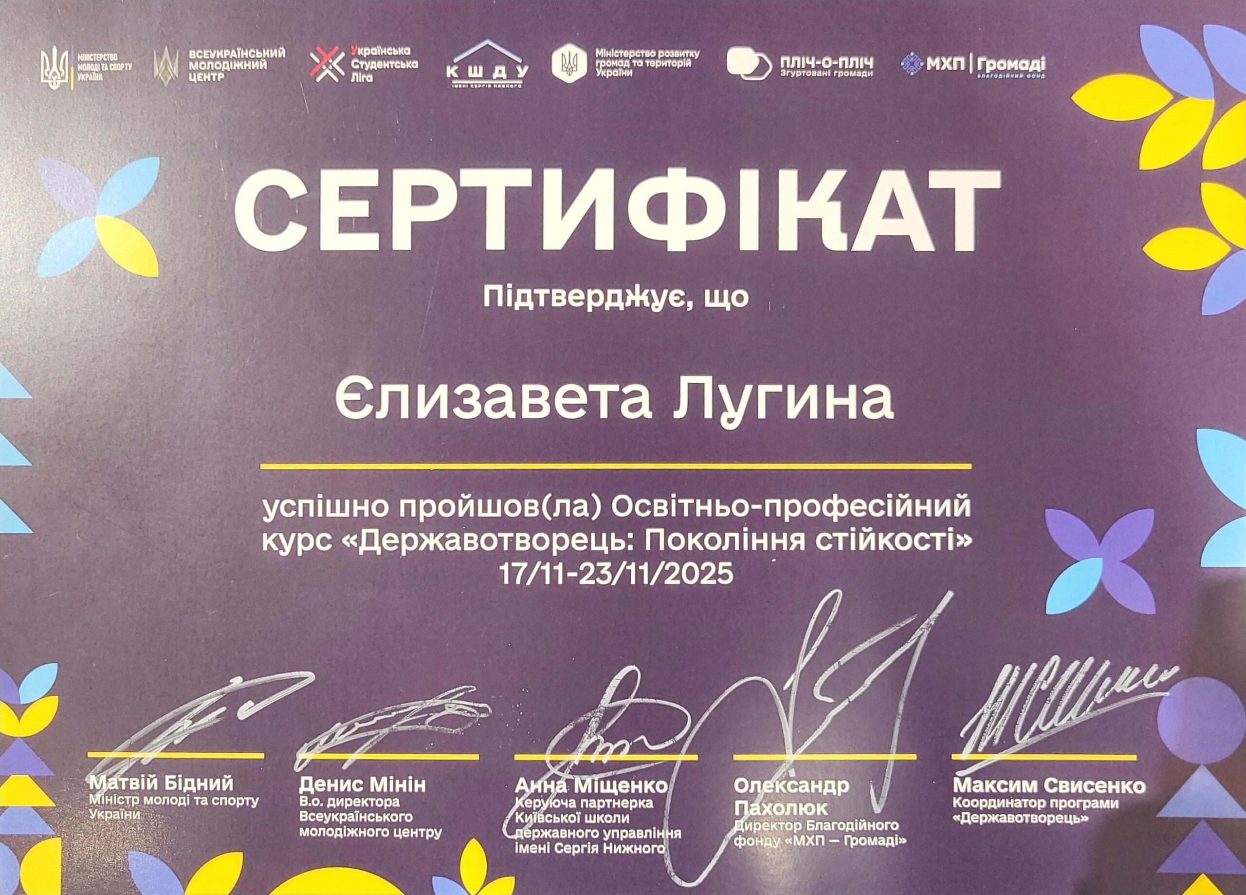 З 17 по 23 листопада 2025 року Лугина Єлизавета, студентка 4 курсу групи ПР-221 юридичного факультету Національного університету “Чернігівська політехніка”, успішно пройшла навчання в одному з найпрестижніших освітніх проєктів для молоді — курсі “Державотворець”.